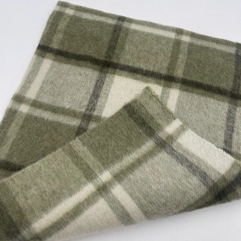Tkanina ta, oznaczona jako artykuł ZZH25001, jest grubo tkaną tkaniną składającą się z 30% wełny i 70% innych włókien. Przy masie jednostkowej wynoszącej 900 g/m materiał charakteryzuje się znaczną gęstością i wagą. Na powierzchni znajduje się wzór zielonej kraty z efektem cienia uzyskanym dzięki specjalistycznym technikom tkackim. Ta metoda konstrukcyjna zapewnia warstwową głębię wizualną w obrębie formacji siatki. Dodatek włókien wełny do mieszanki wpływa na właściwości termoregulacyjne tkaniny. Dzięki tym specyfikacjom technicznym powstała tkanina o dużej gramaturze, odpowiednia na odzież ze strukturą, gdzie wymagana jest wyraźna faktura i wyraźny wygląd.