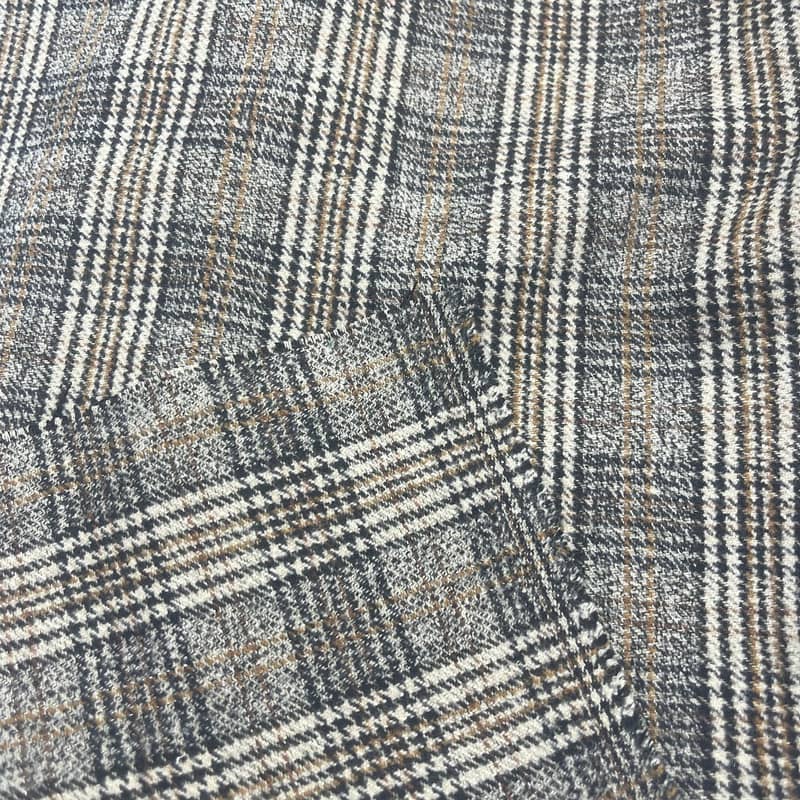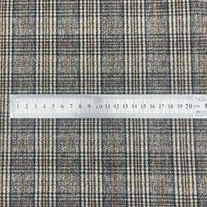 Tkanina ta, oznaczona jako artykuł 250515, jest tkaniną składającą się z 20% wełny, 75% poliestru i 5% spandexu. Dzięki masie na jednostkę powierzchni wynoszącej 450 g/m stanowi konstrukcję o średniej wadze, odpowiednią do garniturowania. Tkanina ma zintegrowany wzór w kratę i pepitkę w kolorze brązowym, zawierający elementy metalicznej przędzy dla wizualnego kontrastu. Dodatek spandexu zapewnia około 20-25% rozciągliwości w poziomie, podczas gdy mieszanka wełny i poliestru zachowuje stabilność strukturalną. To połączenie składu włókien i techniki splotu tworzy tkaninę o określonej elastyczności i definicji wzoru, dzięki czemu można ją stosować na współczesną odzież szytą na miarę, wymagającą zarówno mobilności, jak i estetycznych szczegółów.