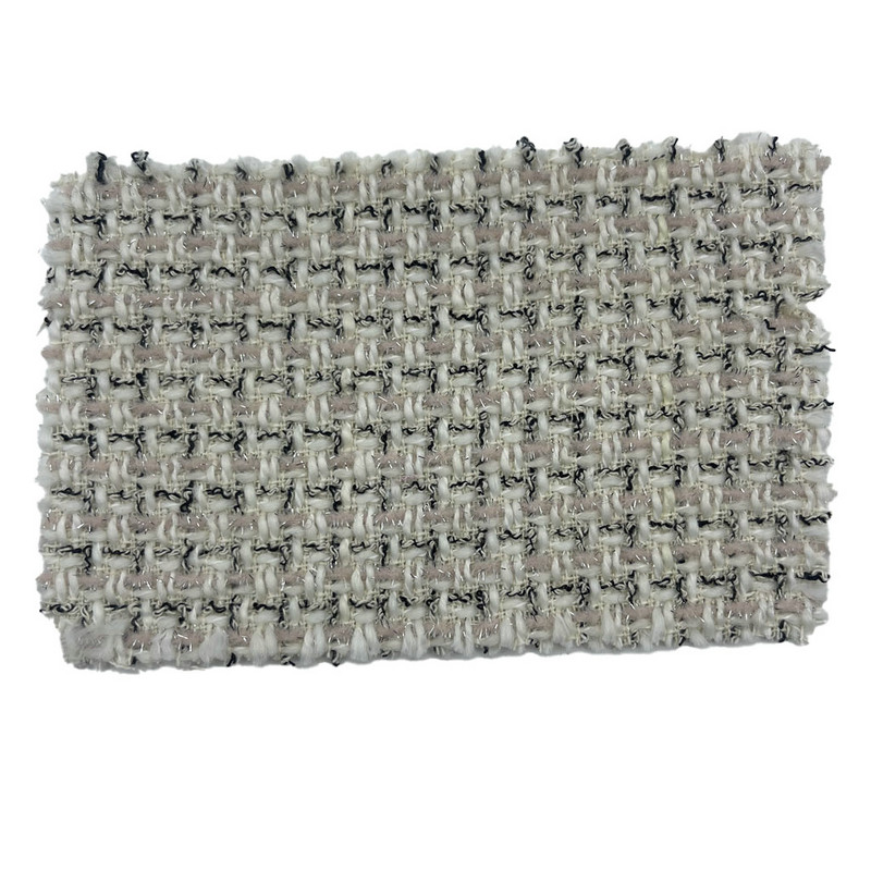 Tkanina ta, oznaczona jako artykuł 23523, jest tweedową tkaniną składającą się z 78% poliestru, 12% wełny i 10% bawełny. Dzięki masie na jednostkę powierzchni wynoszącej 440 g/m2 stanowi średnio-wagą konstrukcję odpowiednią do sukienek. Jasnoróżowa podstawa ma wzór w kratkę zintegrowany w procesie tkania z metaliczną przędzą. Ta kombinacja tworzy kontrast zarówno pod względem wyglądu, jak i odbicia światła. Mieszanka poliestru, wełny i bawełny zapewnia stabilność wymiarową tkaniny, regulację termiczną i odprowadzanie wilgoci. Te właściwości techniczne sprawiają, że ten tweed nadaje się do modnych sukienek, w których wymagana jest definicja wzoru i wydajność materiału.