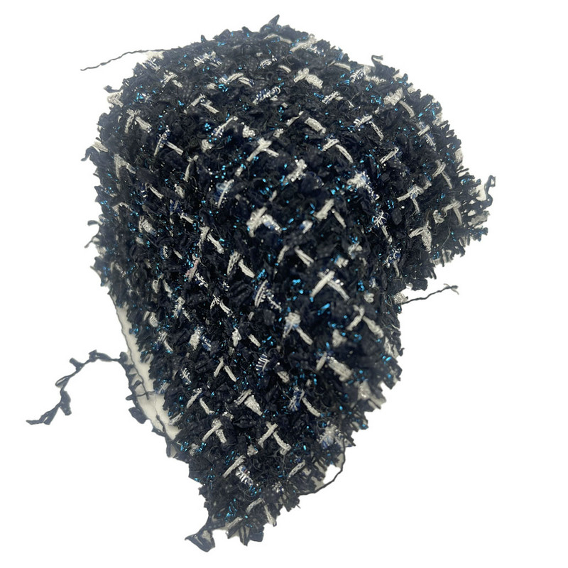 Tkanina ta, oznaczona jako artykuł 23511, to tkanina tweedowa w kratkę, składająca się z 86% poliestru i 14% nylonu. Dzięki masie na jednostkę powierzchni wynoszącej 340 g/m² charakteryzuje się lekką konstrukcją. Ciemnoniebieska podstawa zawiera niebieską metaliczną przędzę w kratkę, tworząc kontrastowy efekt wizualny poprzez zmienne odbicie światła. Mieszanka poliestru i nylonu zapewnia stabilność wymiarową i spójność strukturalną. Dodatek elementów metalicznych dodaje tkanej powierzchni właściwości interaktywnych ze światłem. Te specyfikacje techniczne sprawiają, że ten tweedowy materiał nadaje się do odzieży damskiej, gdzie wymagana jest określona artykulacja wzoru i subtelne zróżnicowanie powierzchni.