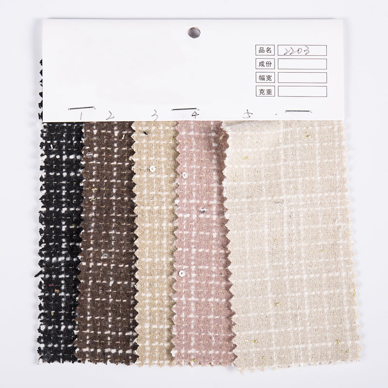 Cekinowa tkanina tweedowa w kratę 2203 to produkt tekstylny wykonany w 100% z wysokiej jakości włókna chemicznego. Dzięki zaawansowanej technologii tekstylnej tkanina ta doskonale łączy w sobie trwałość, odporność na zagniecenia i łatwość pielęgnacji włókien chemicznych, dzięki czemu tkanina zachowuje swój pierwotny kształt i fakturę nawet po długotrwałym użytkowaniu i częstym praniu. Główną cechą tej tkaniny jest jej wyjątkowa cekinowa krata. Elementy cekinowe są równomiernie rozmieszczone na powierzchni tkaniny dzięki delikatnemu procesowi intarsji, który nie tylko uwydatnia wizualne nawarstwianie się tkaniny, ale także ukazuje delikatny i dyskretny efekt połysku pod światłem, dodając niepowtarzalnego uroku odzież. Wzór w kratkę przyjmuje klasyczne dopasowanie kolorów i układ, który nie tylko zachowuje retro urok tweedowej tkaniny, ale także łączy w sobie prostotę i atmosferę nowoczesnego designu, dzięki czemu tkanina może prezentować się elegancko i stylowo przy różnych okazjach. Pod względem tekstury tweedowa tkanina w kratę z cekinami 2203, dzięki procesowi tkania tweedu, nadaje tkaninie bogatą trójwymiarowość i delikatny dotyk. Dobór włókien chemicznych sprawia, że tkanina jest miękka i wygodna, a jednocześnie charakteryzuje się dobrą oddychalnością i odpornością na zużycie, dzięki czemu użytkownik może doświadczyć komfortu i wygody, jednocześnie ciesząc się pięknem mody. Cekinowa tkanina tweedowa w kratkę 2203 charakteryzuje się również wyjątkowo dużą plastycznością i możliwością zastosowania. Niezależnie od tego, czy jest używana do produkcji wysokiej jakości odzieży niestandardowej, czy też akcesoriów do noszenia na co dzień, tkanina doskonale integruje różne style projektowania i wymagania krawieckie, ukazując różne uroki mody.