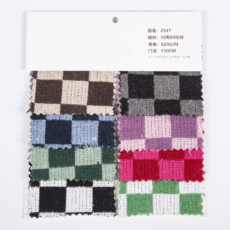 OEM/ODM Kolorowa tkanina Vichy 10% wełny 90% włókien chemicznych w kratę Tweed 2537. Mamy ponad 20-letnie doświadczenie w branży i jesteśmy znani z wysokiej jakości tkanin i przędz.